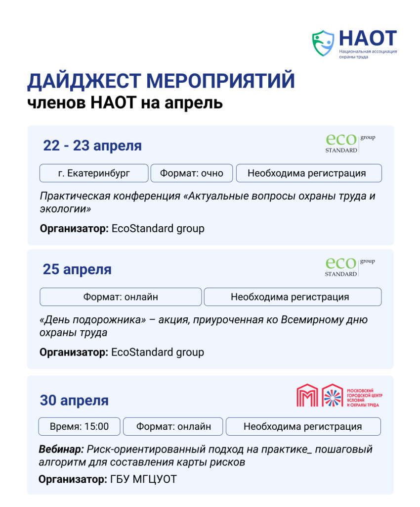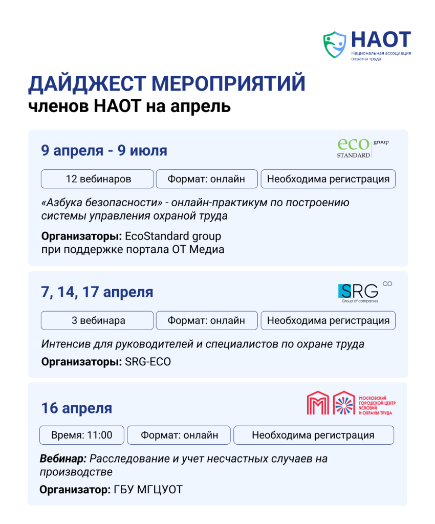 С 9 апреля по 9 июля EcoStandard group и приглашённые эксперты проведут 12 бесплатных онлайн-вебинаров по построению системы управления охраной труда (СУОТ). Разберут ключевые процедуры — от самых базовых элементов до полноценной работающей системы, с чёткой последовательностью шагов и документацией.